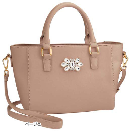 ■ サイズ(cm)/約25×20×10、持ち手高さ約12、付属ショルダー高さ約26〜55(調節可)■ 仕様/開閉マグホック式、内ポケット3(内オープン2、ファスナー1)■ 品質/合皮■ 重量(g)/約775■ 生産国/中国美しく輝く大粒のビジューがポイント。
